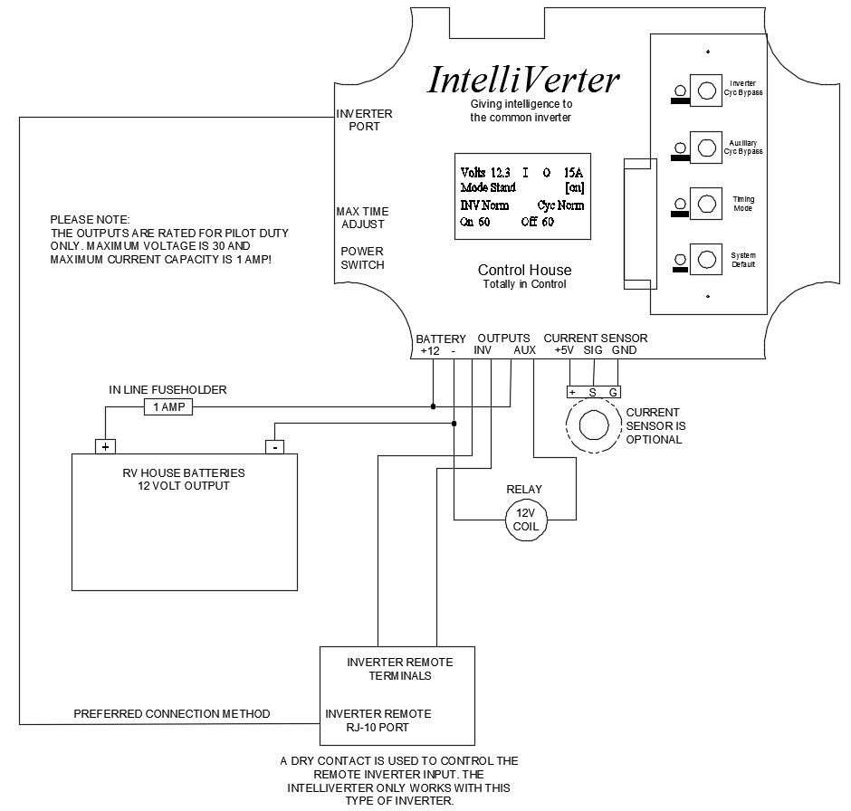 There is a 9 position removable terminal block on the bottom of the IntelliVerter. Each of these 9 pins are identified by the legend printed on the IntelliVerter faceplate as shown above. Please be sure to install an in-line fueseholder with a 1 amp fuse to protect the wiring to the IntelliVerter.