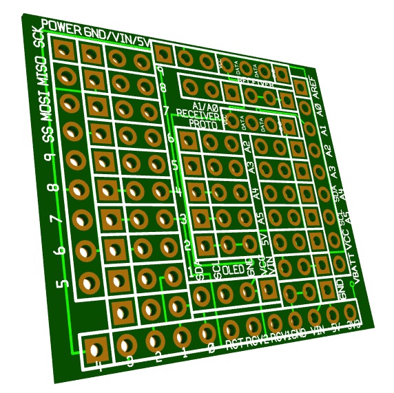 Features All I/O pins from the TinyDuino are available on this board. 12 holese are reserved for the use of a .96" OLED display, and a 433mHz FM Link receiver module. The port for the FM receiver module can be located on the bottom of the shield in either of two posistions. A number of holes remain for your use as a prototype area. The stacking of boards allows enough room so that components may be mounted on the top or bottom of the circuit board. · Small size just slightly larger than the TinyDuino terminal shield. Actual size - 1.2"H x 1.365"W · Saves time develping circuits. In a short time you can develop a project that communicates and displays information or data. Truly plug and play · Through hole technology · Holes located on .100 centers · All holes are .040 in diameter making the connection of most devices possible · With the OLED installed, this board should be the top shield on the stack · Pins A4 & A5 are reserved for the I2C OLED display. Pin 9 is used for data pin of the FM receiver. |