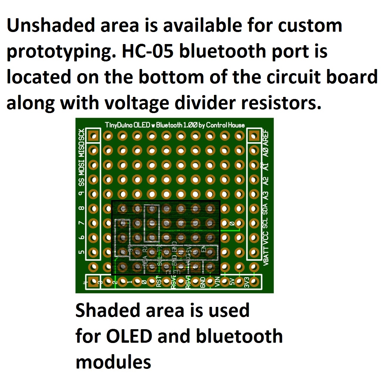 Features All I/O pins from the TinyDuino are available on this board. Holes adjacent to the header pins are tied to the microprocessor. 12 holese are reserved for the use of a .96" OLED display, HC-05 Bluetooth transceiver module, and it's required voltage divider circuit. The port for the bluetooth module is located on the bottom of the shield. That leaves 60 holes for your use as a prototype area. The stacking of boards allows enough room so that components may be mounted on the top or bottom of the circuit board. · Small size just slightly larger than the TinyDuino terminal shield. Actual size - 1.2"H x 1.365"W · Saves time develping circuits. In a short time you can develop a project that communicates and displays information or data. Truly plug and play · Through hole technology · Holes located on .100 centers · All holes are .040 in diameter making the connection of most devices possible · With the OLED installed, this board should be the top shield on the stack · Pins A4 & A5 are reserved for the I2C OLED display. Pins 0 & 1 are used for the serial connection to the bluetooth module |