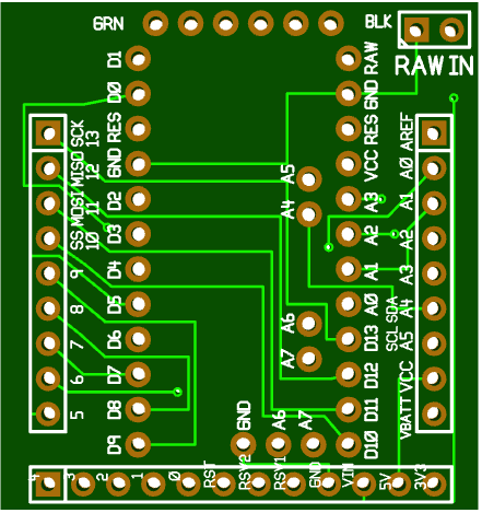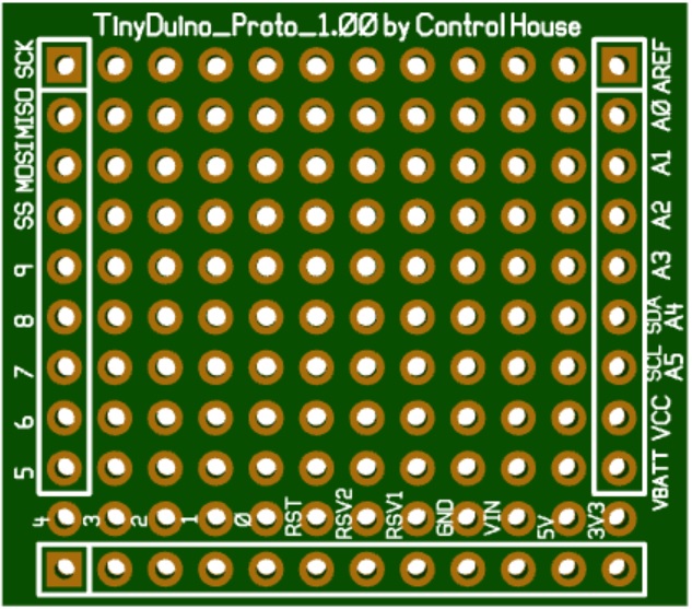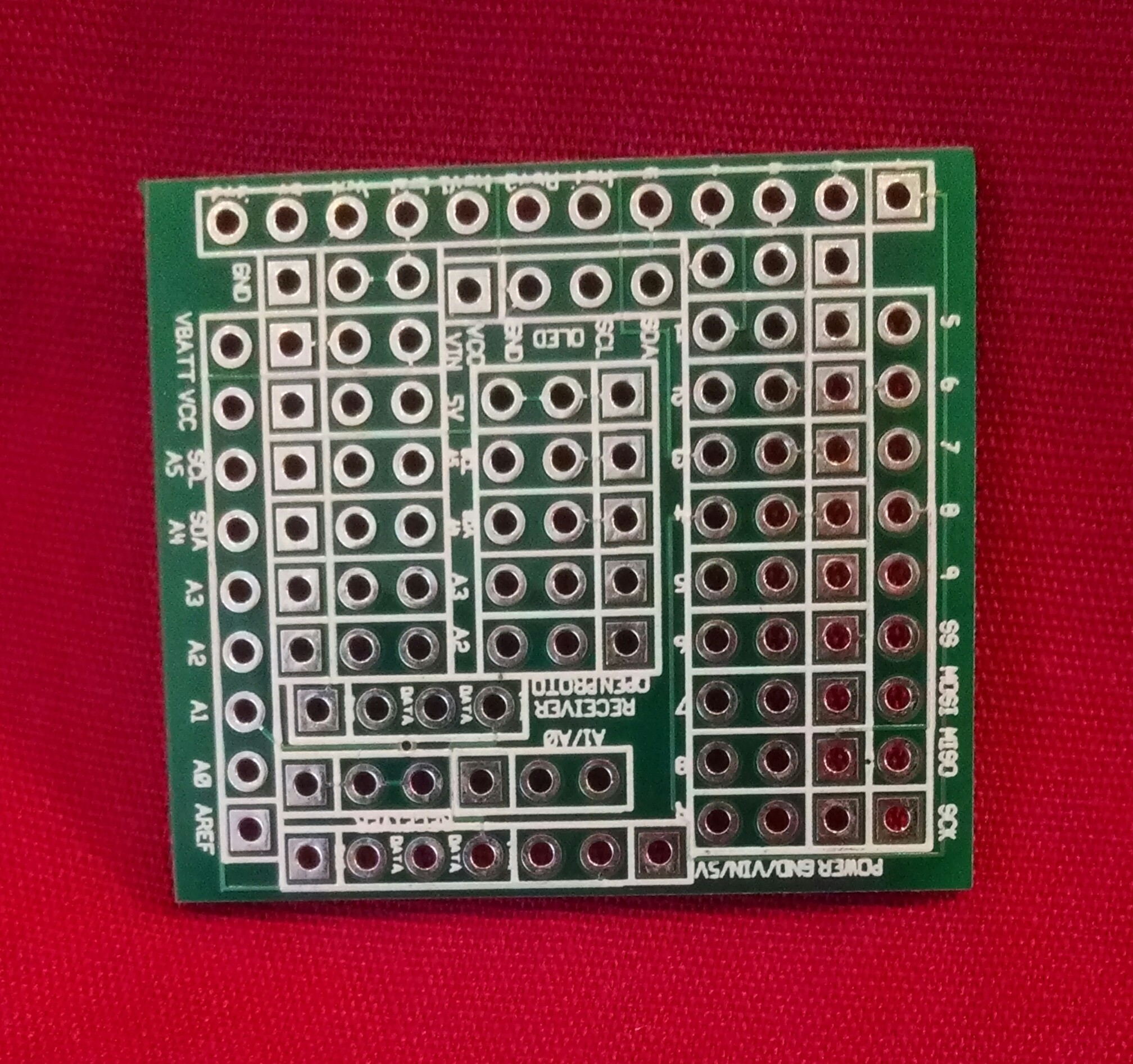 A board prepared for the mounting of a Pro-Mini processor with pins